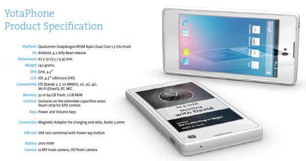 Lo YotaPhone, realizzato dalla Yota Devices, è uno smartphone basato sul sistema operativo mobile Android, una caratteristica che da sola non lo renderebbe un dispositivo degno di nota se non fosse per il fatto che si tratta di un prodotto dotato di un doppio display.