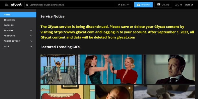 Questi ultimi sono stati quindi invitati a recuperare tutto il recuperabile tramite il sito Web "Gfycat.com", prima della scadenza indicata in precedenza. Giunta quest’ultima assisteremo alla fine di un progetto che da circa 10 anni metteva a disposizione milioni di Gift animate generate dagli utenti nonché diversi strumenti utili per editarle e pubblicarle online.
