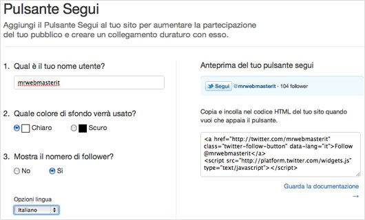 Il piccolo bottone, una volta incorporato, consentirà agli utenti del sito di diventare, con un semplice click, follower del relativo account su Twitter.
