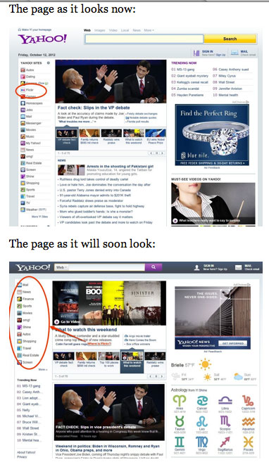 La nuova impostazione dovrebbe presentare il già conosciuto menù verticale per il collegamento con i Yahoo! Sites posto sulla sinistra, dalle immagini attualmente disponibili si noterebbe una mancanza importante tra le voci principali, quella di Flickr, un’assenza che alcuni analisti avrebbero interpretato come la volontà del gruppo di puntare su altre piattaforme.