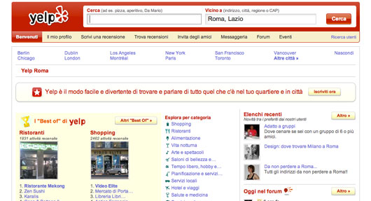 Il servizio per le recensioni sociali Yelp è ora disponibile anche per il nostro Paese, grazie ad esso gli utenti italiani avranno la possibilità di condividere in Rete opinioni e giudizi riguardanti esecizi commerciali, aziende e servizi di vario tipo.