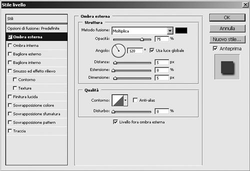 Dopo aver selezionato Ombra esterna, apparirร una finestra di dialogo con vari parametri che puoi regolare per personalizzare l’ombreggiatura: