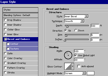si aprirà la finestra sottostante, clicca su Bevel and Emboss e poi spunta la casella, imposta i valori ed i colori come in figura. (Cambiando i valori l’immagine cambia in tempo reale e puoi vedere quali effetti comportano).