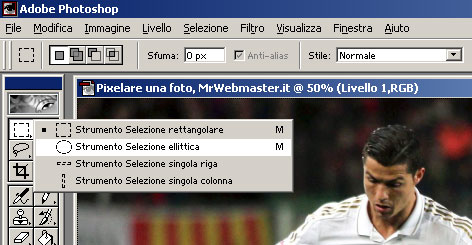 Per prima cosa, utilizzando lo "strumento selezione", scegliamo la forma da voler applicare alla porzione di immagine da censurare: