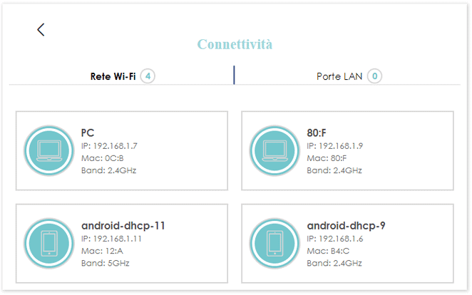Ai fini del discorso fatto in precedenza sugli indirizzi IP privati di classe C può essere interessante dare uno sguardo alla sezione dell’interfaccia utente dedicata ai dispositivi connessi alla propria rete, anche per verificare che tra questi non vi siano device che hanno avuto accesso ad essa abusivamente: