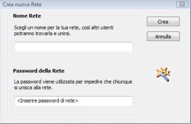 Il programma può a questo punto essere utilizzato per creare una LAN virtuale o per unirsi ad una rete LAN già esistente, clicchiamo sul secondo pulsante da sinistra, in basso nella finestra principale, e selezioniamo dal menu a tendina l’opzione “Crea nuova rete”: