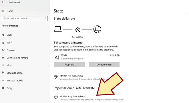 Su Windows 10 basta aprire le โImpostazioniโ di sistema per poi seguire il percorso โRete e Internet > Modifica opzioni schedaโ, quest’ultimo si trova nella sezione โImpostazioni di rete avanzateโ.