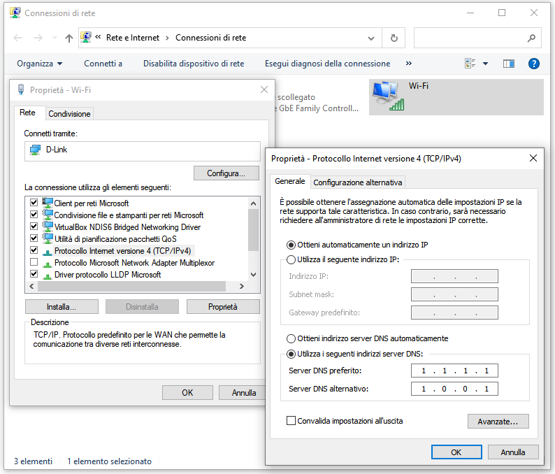 Da tale posizione รจ necessario cliccare 2 volte sull’elemento โProtocollo Internet versione 4โ e, dalla finestra di proprietร ora aperta spuntare il radiobutton corrispondente all’opzione โUtilizza i seguenti server DNSโ. Nel campo โServer DNS preferito:โ si deve digitare โ1.1.1.1โ, mentre nel campo โServer DNS alternativo:โ il valore da utilizzare รจ 1.0.0.1. Una volta cliccato su โOKโ i nuovi DNS saranno impostati e operativi. La stessa operazione puรฒ essere svolta per il protocollo IPv6 indicando come DNS primario โ2606:4700:4700::1111โ e come DNS alternativo โ2606:4700:4700::1001โ.