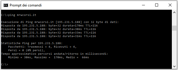 Nello specifico ping รจ un comando per la diagnostica di rete che consente di verificare se un terminale locale o remoto (quando inserito in un network pubblico) puรฒ essere raggiungibile. Il valore 195.231.5.188 generato in output dallโistruzione proposta in precedenza รจ lโindirizzo IP (Internet Protocol) del server Web in cui si trova il sito Web associato al nome a dominio (โmrwcorsi.itโ) passato come argomento al comando.