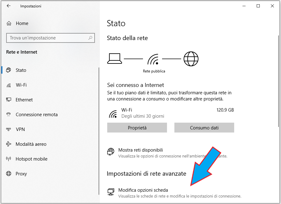 Per utilizzare i DNS di Google su Windows, e nel caso specifico del nostro esempio su Windows 10, รจ possibile accedere alle โImpostazioniโ del sistema per poi selezionare โRete e Internetโ e, dalla finestra cosรฌ aperta, la voce โModifica opzioni schedaโ nella sezione โImpostazioni di rete avanzateโ.