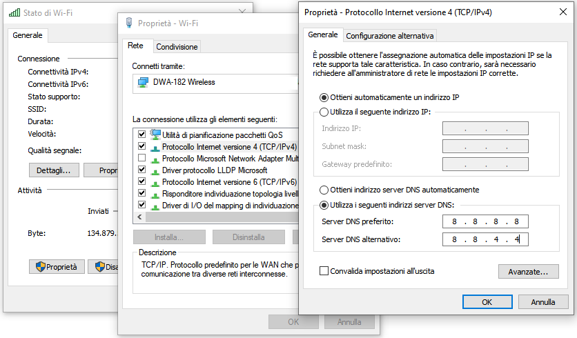 Viene cosรฌ aperta una finestra che consente di accedere alle informazioni riguardanti lo stato della connessione di rete scelta. Cliccando su โProprietร โ viene visualizzata unโulteriore finestra e, in corrispondenza della scheda โReteโ, si puรฒ consultare una lista degli elementi utilizzati dalla connessione, quello di nostro interesse รจ โProtocollo Internet versione 4 (TCP/IPv4)โ. Un doppio click su di esso consente di modificarne le proprietร .