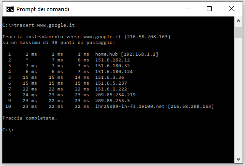 TRACERT รจ un’utilitร di diagnostica a cui si accede dal โPrompt dei comandiโ del sistema operativo di Microsoft, una volta avviato quest’ultimo รจ poi sufficiente lanciare il comando tracert seguito dal nome (con o senza prefisso โwww.โ) o dall’indirizzo IP dell’host di destinazione: