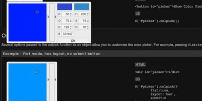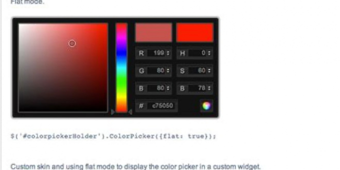 Un plugin jQuery un color picker con supporto RGB e HEX. Il plugin è piuttosto leggero (28Kb) e non utilizza immagini (il tutto è basato su CSS e JS).