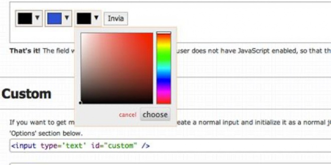 Questo plugin per jQuery consente di integrare un color picker all’interno dei nostri form. Il plugin dispone di diversi metodi di comparsa per la finestra di selezione (hover o click) e supporta diversi effetti (slide, fade, ecc.).