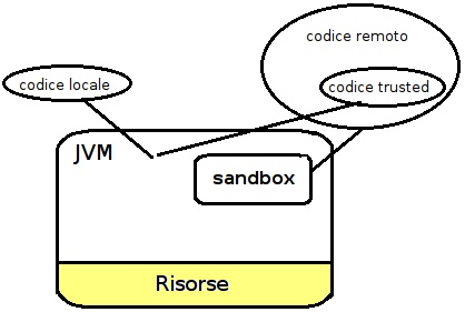 Nella sua prima implementazione, schematizzata in figura, la sandbox distingueva grossolanamente solo tra codice locale e codice remoto: il primo godeva di accesso completo a tutte le risorse "critiche" del sistema quali, ad esempio, il filesystem e i vari devices; il codice remoto, al contrario, aveva un limitato accesso alle risorse, mediato dalla sandbox stessa: le applet, ormai sostanzialmente scomparse dal panorama web, ne sono stato il più noto esempio.