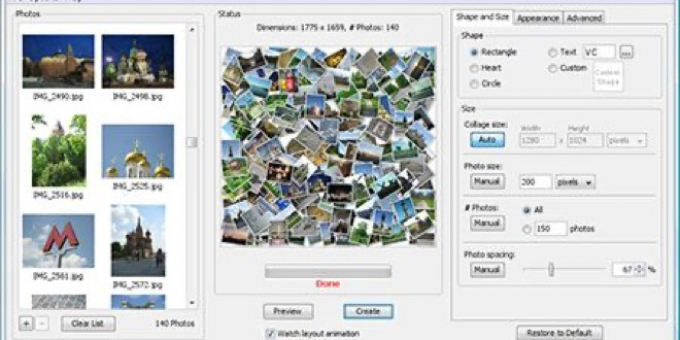 Il sistema proprietario integrato in Shape Collage è in grado di disporre automaticamente le foto in base alle loro caratteristiche, dimensioni ed orientamento. Le composizioni possono assumere la classica forma quadrata o rettangolare oppure, come già detto, assumere le forme più singolari. Il risultato potrà essere esportato nei formati JPEG, PNG o PDF.