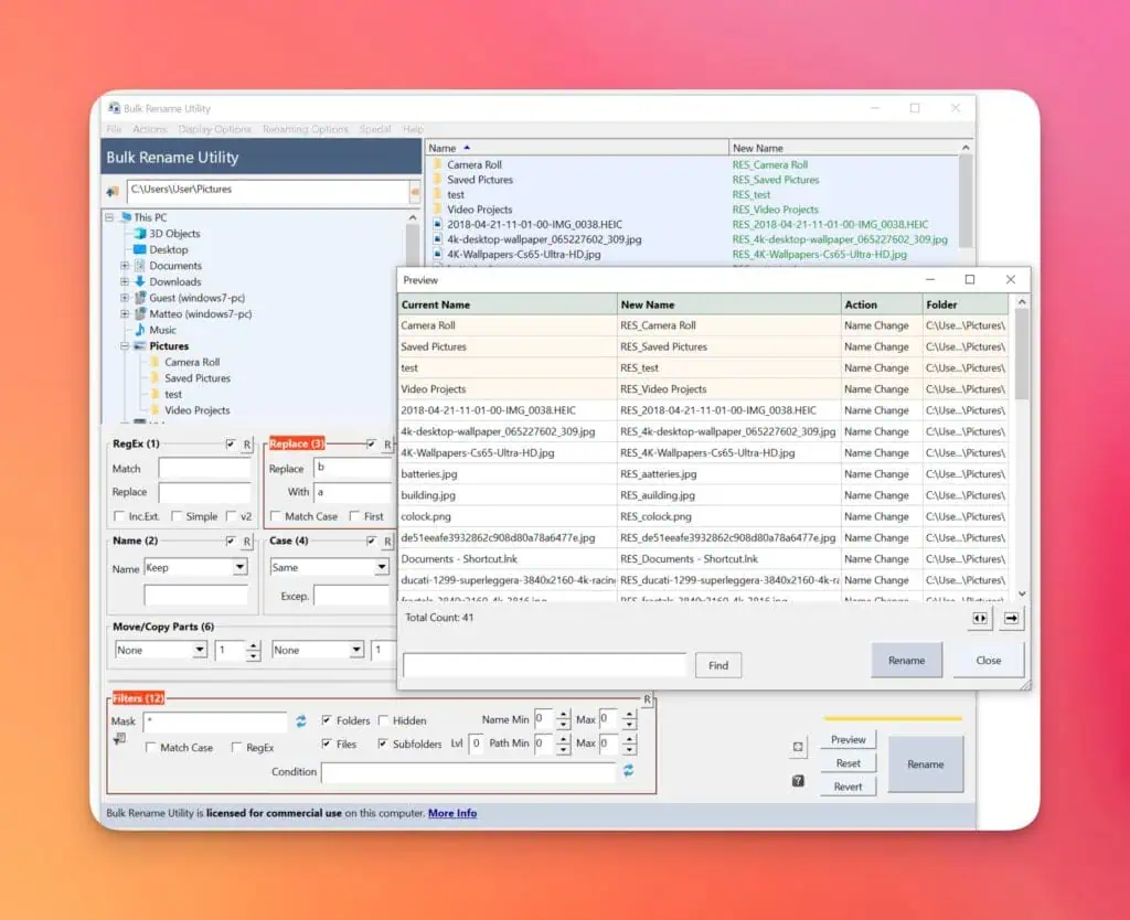 Bulk Rename Utility è un software versatile e gratuito per rinominare file e cartelle in massa. Offre un’interfaccia ricca di opzioni, ideale per utenti esperti. Permette modifiche rapide con funzioni avanzate come numerazione, sostituzioni e gestione di metadati. Perfetto per chi cerca precisione e controllo nel file management.