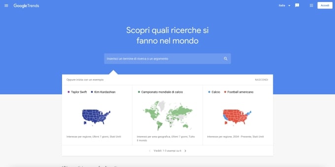 Google Trends è uno strumento ufficiale di Google che permette di conoscere la frequenza con cui, una determinata parola o frase, viene cercata all’interno della Ricerca Google.