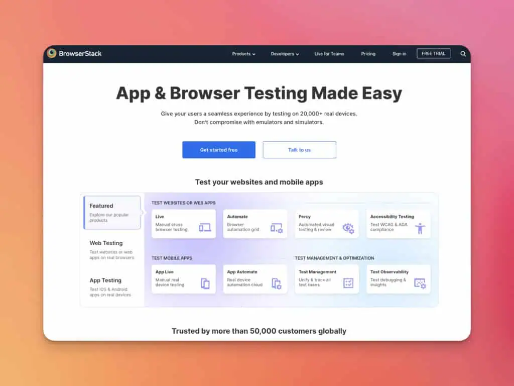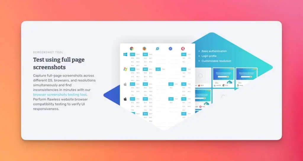 Browserstack , tra le varie funzionalitร , consente di testare rapidamente i tuoi progetti web generando screenshot su oltre 2000 browser mobili e desktop con un solo clic. ร perfetto per testare il design responsivo su una vasta gamma di dimensioni e risoluzioni dello schermo senza doverlo fare manualmente.