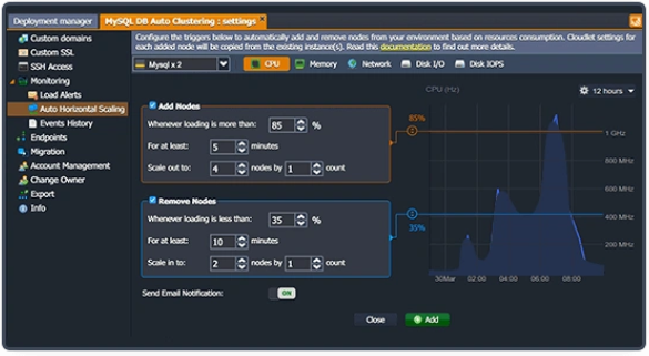 Jelastic Cloud supporta automaticamente la scalabilità orizzontale e verticale delle risorse attraverso appositi bilanciatori, inoltre il traffico viene distribuito automaticamente in modo da ottimizzare l’impiego di CPU, storage e memoria RAM sui vari task in esecuzione.