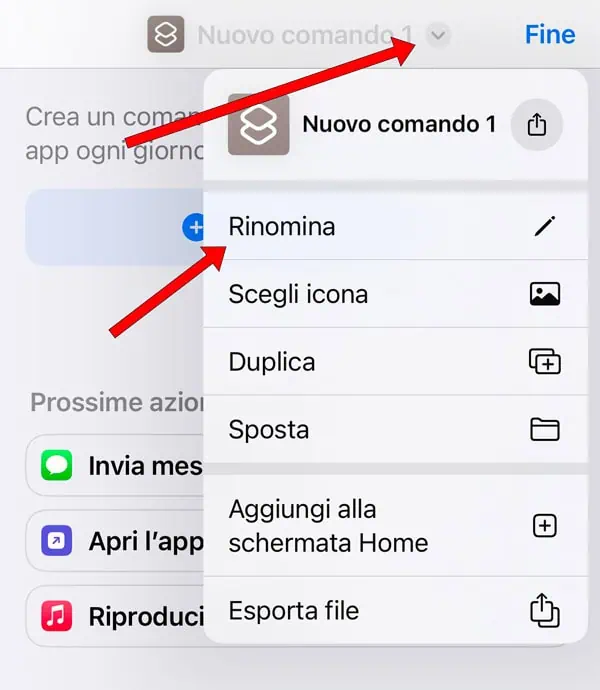 Il comando viene creato con un nome di default. Puoi rinominarlo cliccando sulla frecciata accanto al nome che apre un menu con una serie di opzioni tra cui “Rinomina”.