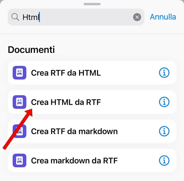 Cerca e seleziona lโazione โCrea HTML da RTFโ (RTF รจ acronimo di Rich Text Format)