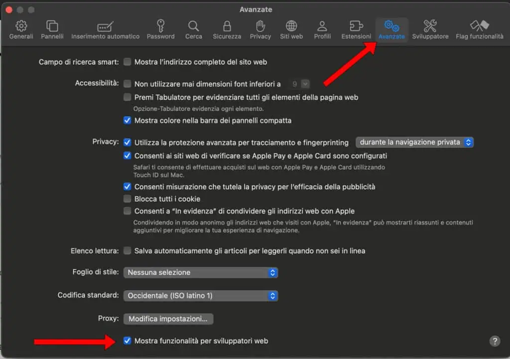 Ora apri Safari sul tuo Mac. Vai su Safari > Impostazioni > Avanzate e seleziona la casella Mostra funzionalitร per sviluppatori web.