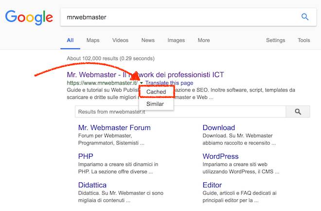 Per usare la cache di Google o di Bing basta eseguire una normale ricerca inserendo nel campo di ricerca il nome del sito o l’indirizzo specifico a cui siamo interessati. Verrà quindi mostrato l’elenco dei risultati. A questo punto basterà cliccare sulla piccola freccia verso il basso situata a fianco dell’indirizzo presente in ciascuno dei risultati mostrati.