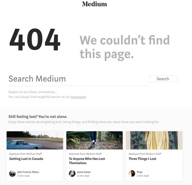 Per esempio il sito Medium (piattaforma di pubblicazione online creata dal cofondatore di Twitter, Evan Williams) dà la possibilità di cercare nuovi articoli, inserisce in alto il proprio logo e un link esplicito che permette di tornare alla pagina iniziale. Suggerisce quindi tre articoli nel cui titolo compare la parola chiave "lost".