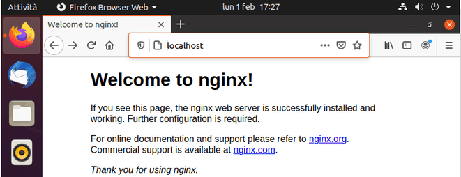 Un ulteriore controllo puรฒ essere effettuato via browser Web, aprendo ad esempio Firefox e digitando la stringa localhost nella barra degli indirizzi. Se tutto dovesse essere andato per il meglio verrร visualizzata la schermata di benvenuto di NGinx: