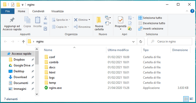 ร comunque possibile scaricare NGinx per Windows dal sito ufficiale del progetto, una volta effettuato il download e scompattato l’archivio compresso cosรฌ ottenuto si ha a disposizione una directory dotata della seguente struttura: