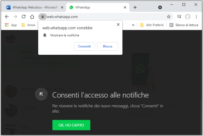 Esattamente come accade con l’applicazione mobile di WhatApp, anche WhatsApp Web permette di ricevere le notifiche relative ai messaggi in arrivo. Trattandosi di una Web application, perchรฉ siano disponibili queste ultime devono essere perรฒ autorizzate cliccando sul collegamento โAttiva notifiche Desktopโ e successivamente su โConsentiโ.