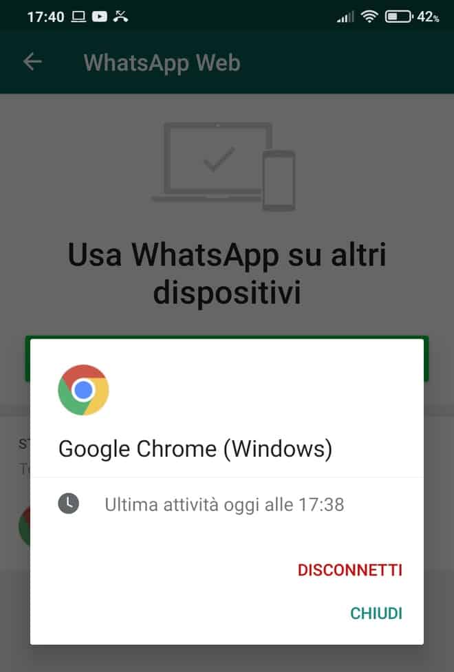 Il sistema prevede in ogni caso la possibilitร di un down della connessione ad Internet e, nel caso in cui quest’eventualitร si verifichi, non รจ necessario effettuare una nuova autenticazione per riprendere l’utilizzo di WhatsApp Web. Per disconnettere definitivamente il dispositivo collegato basta invece toccare da smartphone il pulsante โDisconnettiโ presente nella finestra โWhatsApp Webโ di WhatsApp.